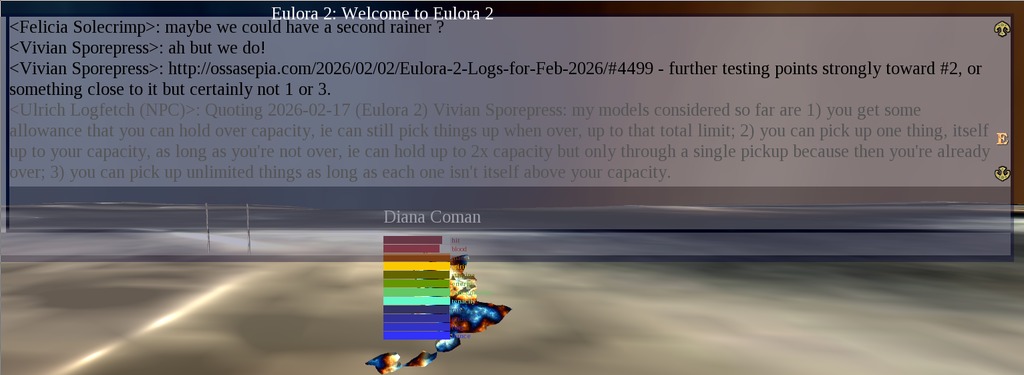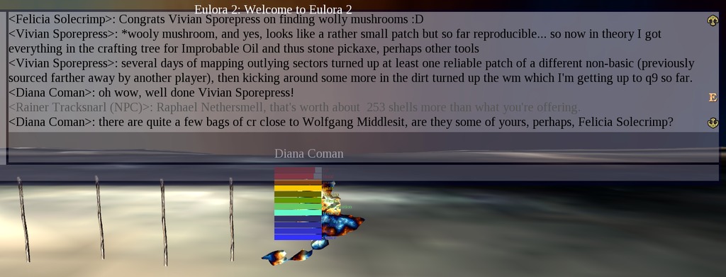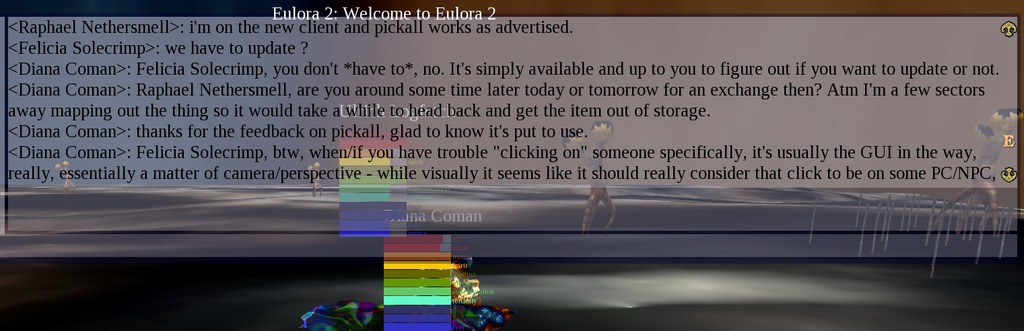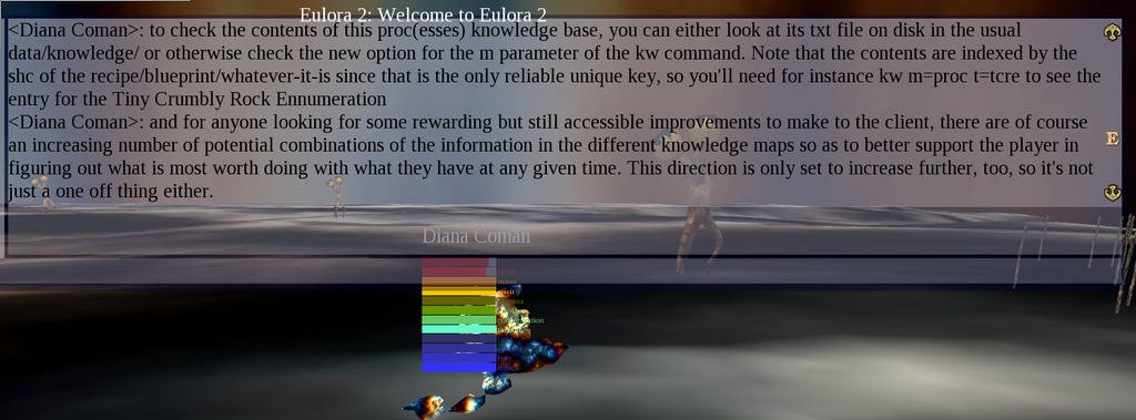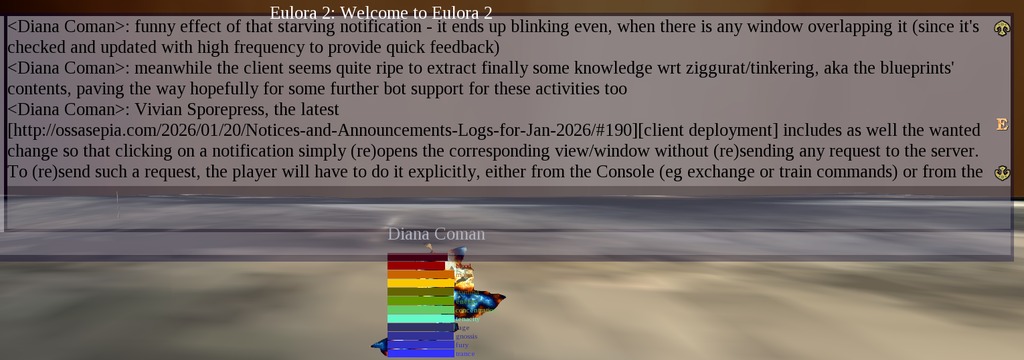 Increased player activity pushed as usual for additional ways in which the client can be more helpful or more of use. And as is the habit in Eulora 2, the client promptly improved as needed, to help players along. Among the various changes, tweaks and additions, there is now a more reliable progress bar that picks up on work even when started by the bot rather than by the player directly, and there are new automated checks and warnings when overweight/overbulk or when running out of food.