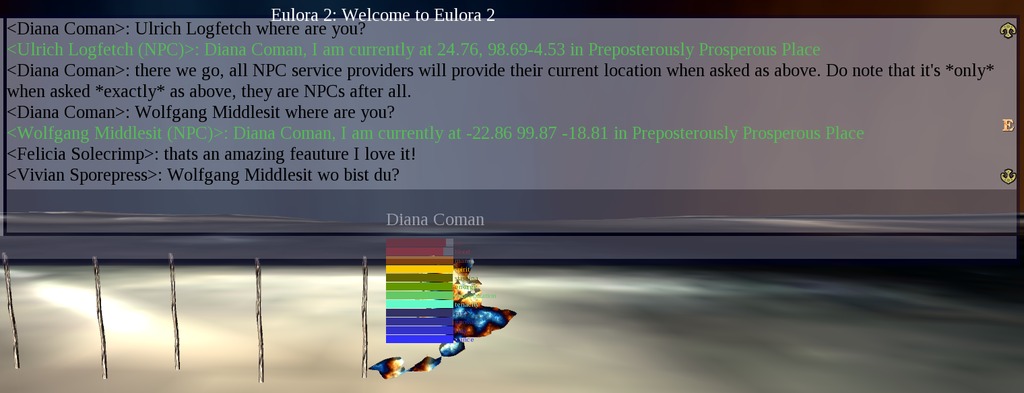 Faced with this question, even NPCs can now provide a very clear answer - and it turns out to be quite a useful and used feature indeed. The occasional hiccups coming only from the NPCs' rather strict parsing of text and consequent requirement that the question is indeed provided exact in the form shown, without any additional spaces and with their full name included, as well.