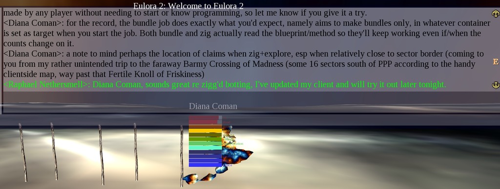 One rather unexpected side effect of the bot's increased capabilities is that players found themselves taking at times extended unplanned journeys that got them way further than intended. And given the infinite and infinitely expanding euloran sectors in all directions, such unplanned journeys can easily leave one quite at a loss as to which direction they should even take to get *back* rather than forever further away from the yet small, yet emerging civilized society.