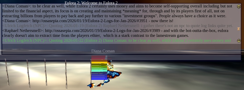 As the euloran economy kept charging up through both PC and NPC activity, the resident towncrier added to his duties to compile and provide a monthly report of economic activity as reflected in increases and decreases of value (cash and items) held by three main relevant groups: PCs, NPCs and the environment itself. The reports were warmly welcomed by players, with additional wishes and observations promptly noticed and answered to, as always.